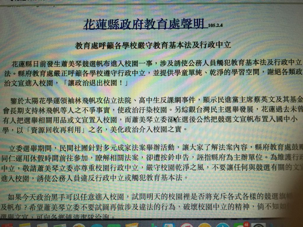 「另綜觀台灣民主選舉發展,花蓮過去未曾有人把選舉相關用品或文宣置入校園;而蕭美琴立委卻在選後公然把競選文宣帆布置入國中小學,以『資源回收再利用』之名,美化政治介入校園之實。」