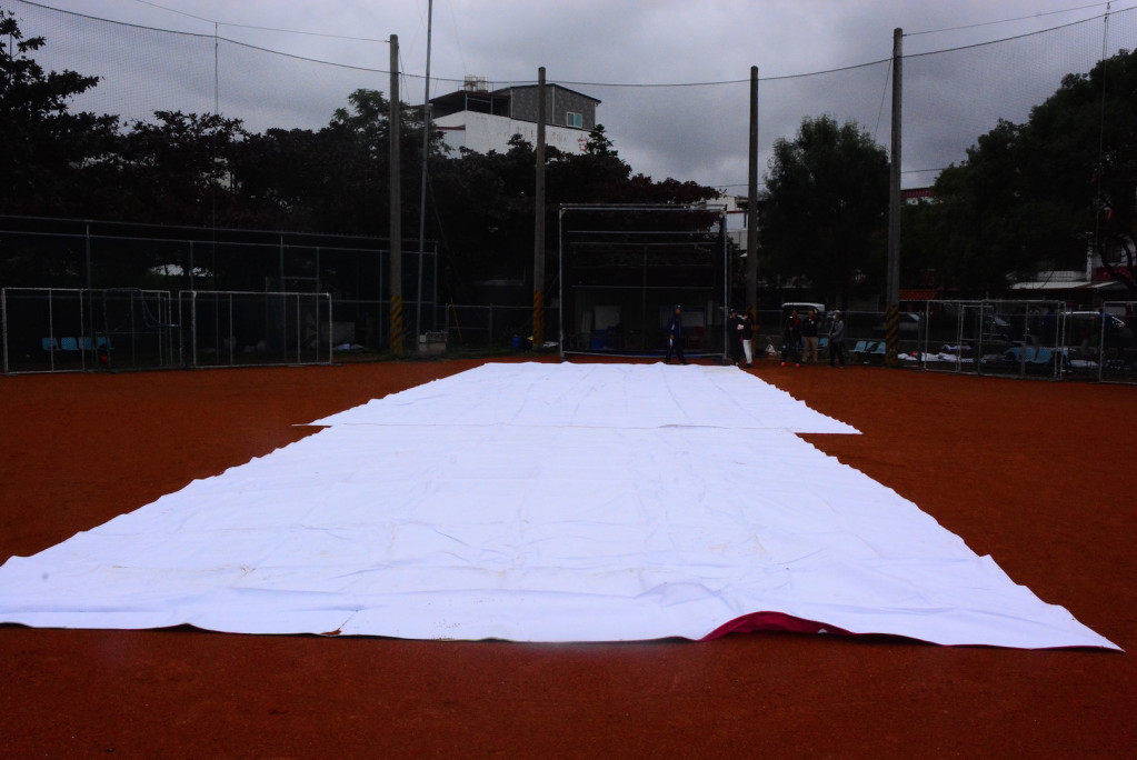 蕭美琴捐贈的競選帆布,覆蓋球場紅土時「臉部朝下」。蕭美琴笑稱,她和小英都「吃土」了。(資料照片,王志偉攝)