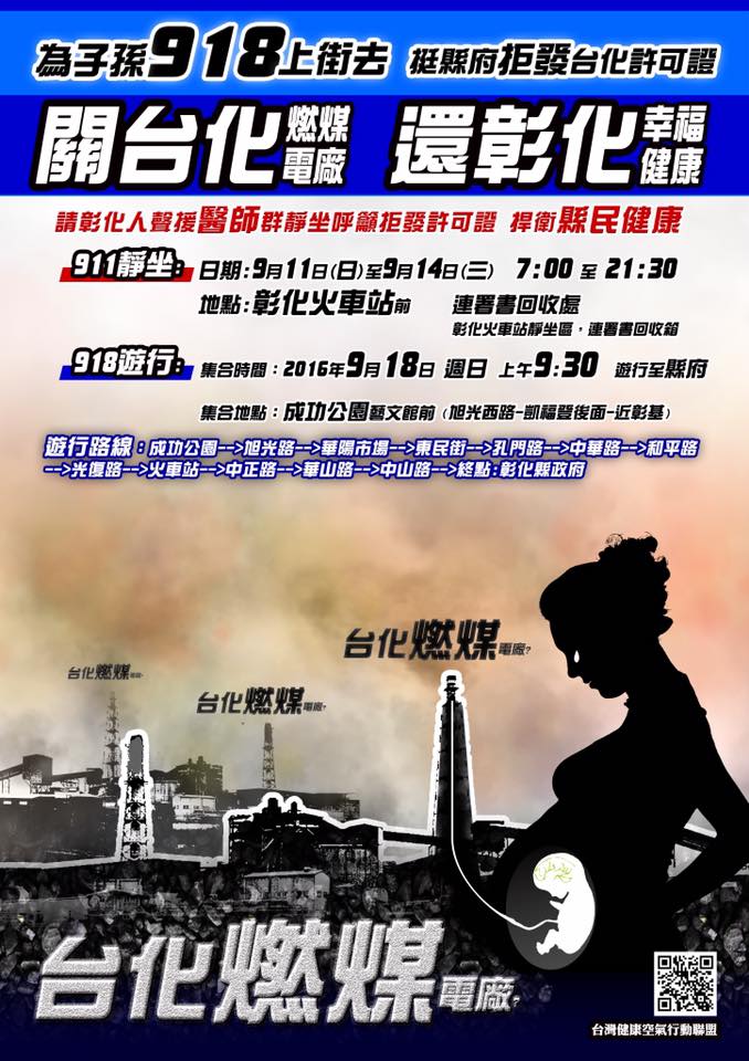 由醫師們首先發難插旗反台化,經過短短一星期的連署、靜坐、宣傳等活動,九一八大遊行定18日上午9:30,在中山路及旭光路西側路口,地方稅務局旁的成功公園集合,遊行市區,到縣政府前表達反台化、拒發燃煤許可證的心聲,預定12:00結束。