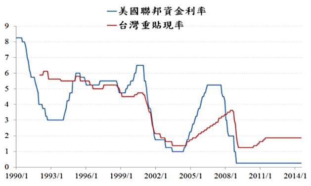 美國Fed升息當然會左右我國央行貨幣政策的走向,不過台灣的升息時程與步驟將較美國更為和緩。回顧2004年中至2006年中期間,Fed將聯邦資金利率(fed fund rate)由1.0%升至5.25%(共升了4.25個百分點),同期間台灣官方基準利率---重貼現率則上升了2.25個百分點,升幅約僅美國之半,且台灣隔夜拆款利率更僅上升了1.2個百分點,僅約台灣重貼現率升幅之半。若美國Fed明年第一季左右開始升息,考量台灣貨幣政策約滯後美國約一季左右,台灣首次的升息時點將落在明年中,而我國重貼現率調升速度可能是每季半碼,升息幅度和緩。