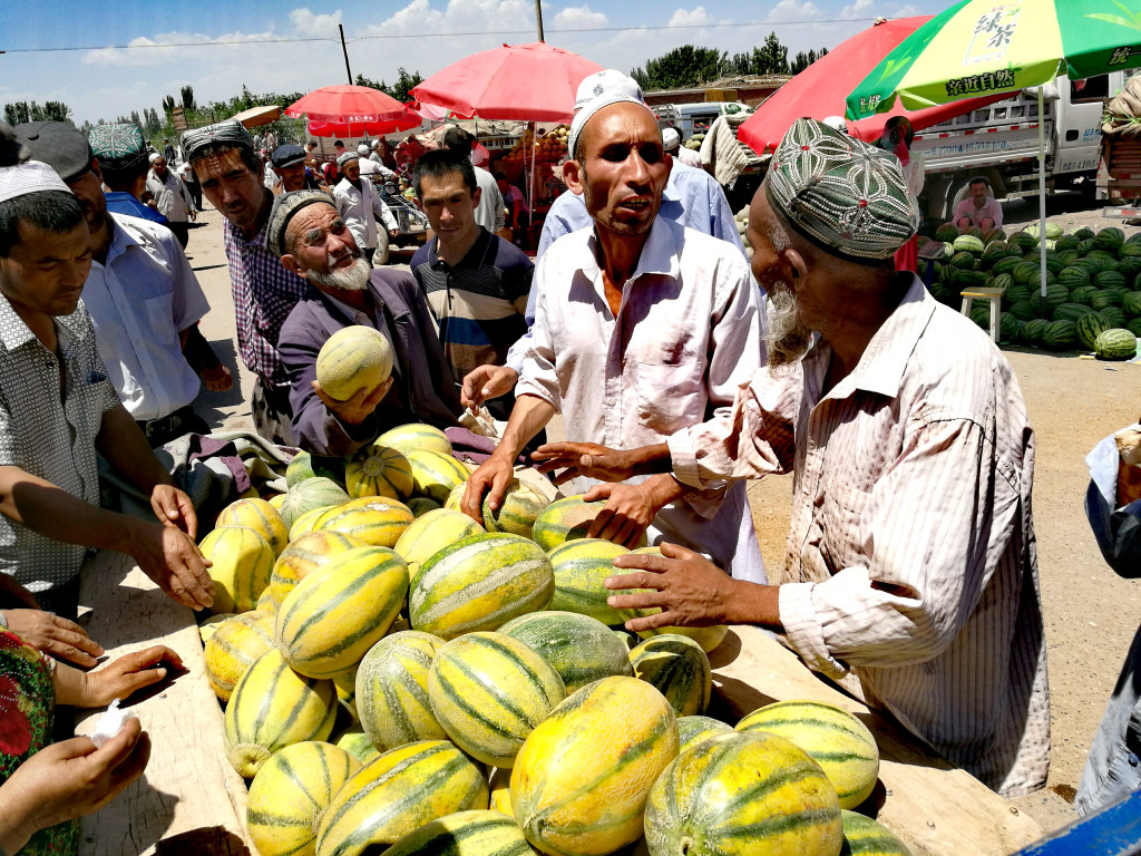 在緩慢的城市步調中裡,唯一的忙碌氛圍,大概是來自大巴扎裡的熱鬧與喧騰。「巴扎」,是維吾爾語裡集市、市場的意思。在維吾爾人的聚居地,差不多每一個村落鄉鎮裡都有那麼一個巴扎,它幾乎遍布新疆的任何角落。巴扎裡頭的喧鬧,主要來自活絡的牲畜貿易與瓜果市集,尤其是豐滿的羊羔連同肥碩的瓜果,是如此叫所有見著它的人都心生妒忌。