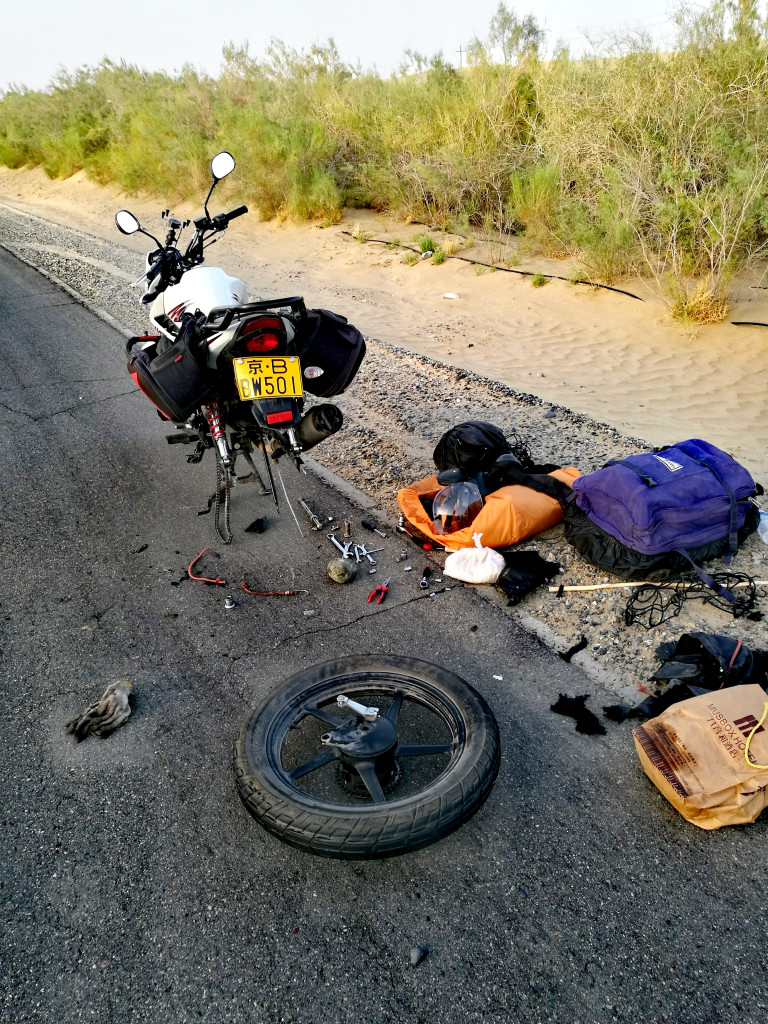 我以為摩托車壞了、一切結束了、走完半個中國的旅程必須就此停止了。瞬間內心湧出許多不甘、抵抗、懷疑、甚至是憤怒的情緒。然而,這些想法永遠解決不了眼前必須面臨的問題。小巴沒死、我還在,足夠的維修工具加上以前的沙漠徒步經驗,這或許只是個人又一次面對堅強與軟弱的抉擇。在面臨即將迅速降溫的夜幕,還有僅剩半瓶的飲用水,加快行動徒步出去也許是最好的選擇。