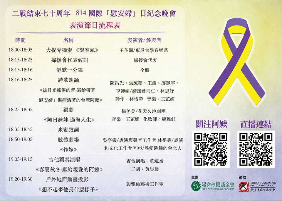 每年的8月14號是「國際『慰安婦』紀念日」,今年剛好是二次大戰結束70周年,更加突顯其歷史意義。因此,婦援會將於8月14號當天晚上,在日本交流協會附近的慶城公園,舉辦一場「Comfort Women Never Be Forgotten國際『慰安婦』日」紀念晚會。包括多個關心婦女人權議題的公民團體代表都將出席這場紀念晚會,我們也會在現場發放象徵和平的黃絲帶與象徵反性別暴力的紫絲帶,給前來參加活動的民眾。