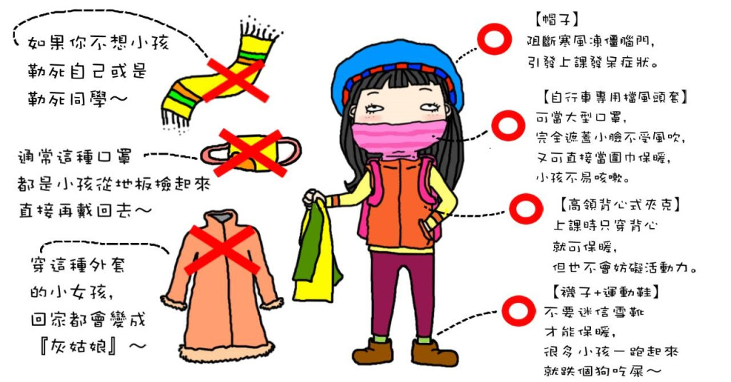 只見每個小孩進到校門、都像是把棉被綑在身上似的,厚重到連書包都背不上,更別提還托著、拉著的提袋、餐袋和水壺。進到教室,小小的一張椅子,又要掛書包掛袋子,根本騰不出多餘的地方掛上剛從身上剝下來的「熊皮」。如果勉強穿在身上,就看見一隻小熊握著筆、吃力地想把字寫流暢、卻又被長長的袖子卡住行動的能力。