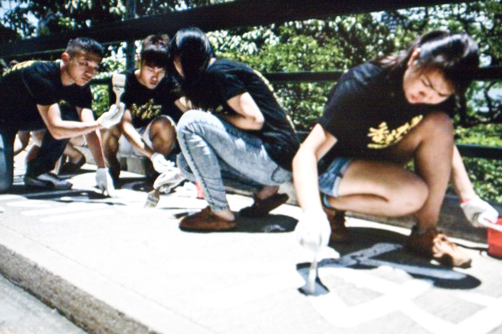 (本週四,香港大學的學生在六四當天,自行舉辦紀念活動,並在地上寫下:「民主火花永不滅」的砥勵標語)