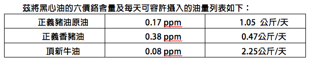 從前表看出,成人每天攝入470克正義香豬油是有可能的。而六價鉻在人體內的累積性及其毒害,尤其是致癌性,以及對孕婦、孩童的健康影響,也要重視。因此前述政府官員「避重就輕」的見解,有探討的必要。近日讀到外交官魯肇忠先生發表「食安地雷 百姓自救之道」一文,其中指出「每天百姓都在吃毒,…政府與百姓為何還如此麻木」,令人十分感慨!