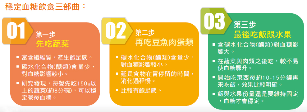 良好的血糖控制,除了適當的藥物介入外,運動與飲食都是不可或缺的。運動與飲食的控制,需要病人自己努力執行,才能獲得理想的結果。飲食控制最重要的原則,就是定時定量與均衡飲食。最近的研究證實,只要改變進食順序:先吃蔬菜、再吃肉、最後吃飯,能更容易的控制好血糖。