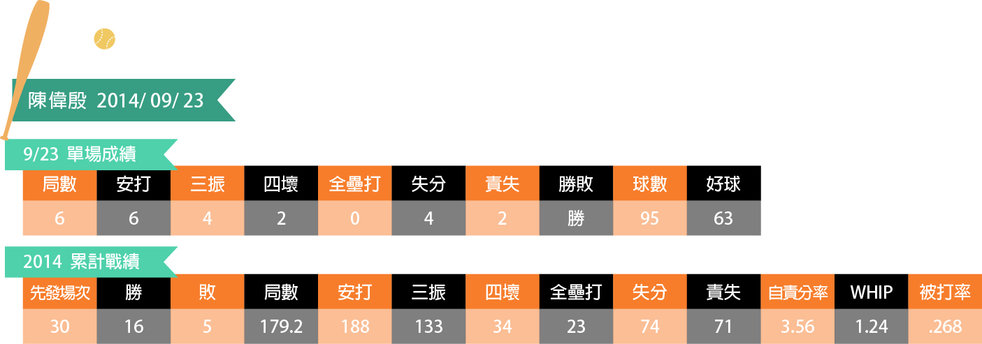 本季首場優質落敗,往好處想是敗得不難看,自責分率持續下修,3.56是今年新低。此役是他本季的第15場優質先發(出賽30場),優質率已上升至5成,只要他下一場再有佳作,連3年優質率均在5成以上。9月4度先發,只有前一場未達6局,換算自責分率低至1.82。成績如此優異,相信教練團看在眼裡鐵定記在心裡。