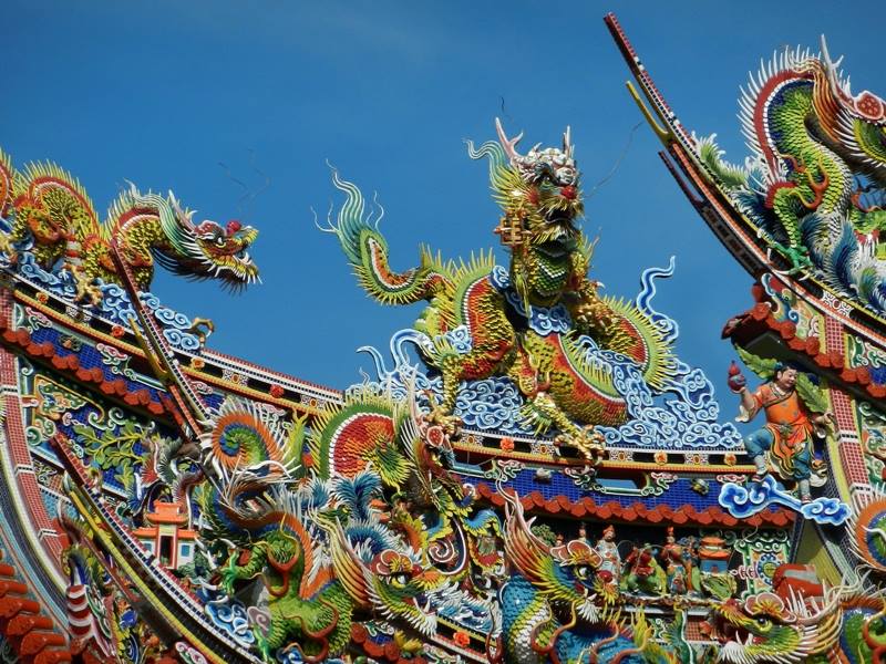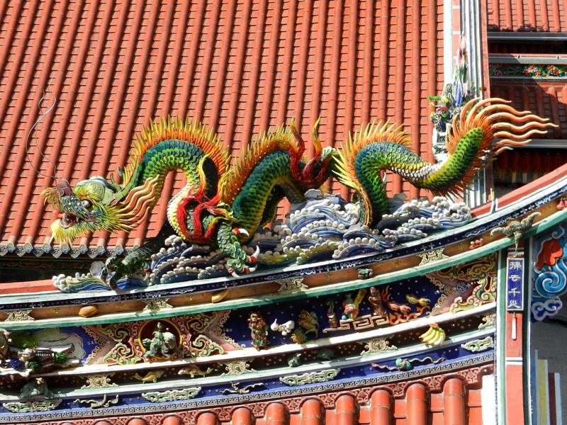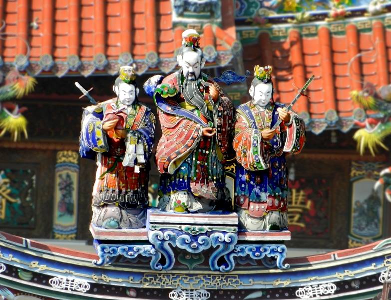 過去他施作的廟脊,只作過「福祿壽三仙(財子壽)」,在慈濟宮他第一次看到廟脊正中站著由劍童、印童隨侍的「元始天尊」,而且塑像基座,仿照桌案的吞腳、勒水形制,十分講究,與南部廟宇一般作法不同。這裡的三角堵不但裝飾花草、螭虎,也裝飾山巒樹林、人物戲齣。大壁頭一面作團龍,另一面則作獅頭避邪,都加線框框出空間,再製作人物在空間中。這種線框手法,陳三火第一次看到,也照著製作。