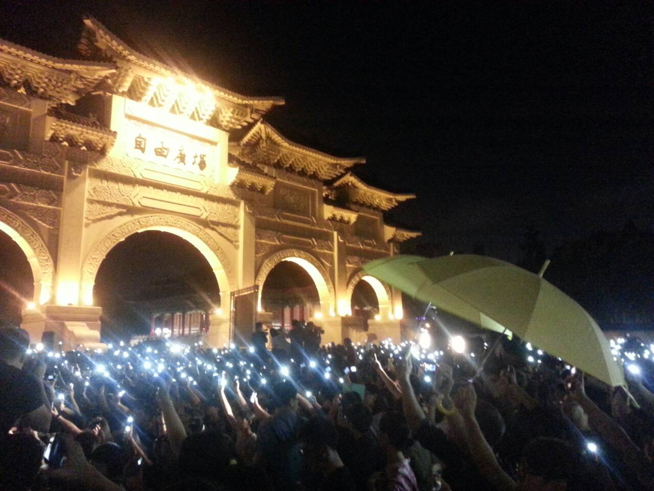 夜幕低垂,群眾高舉手機與雨傘,現場形成一片燈海,高唱「海闊天空」,感受得到聲援港民爭取民主自由的熱情。