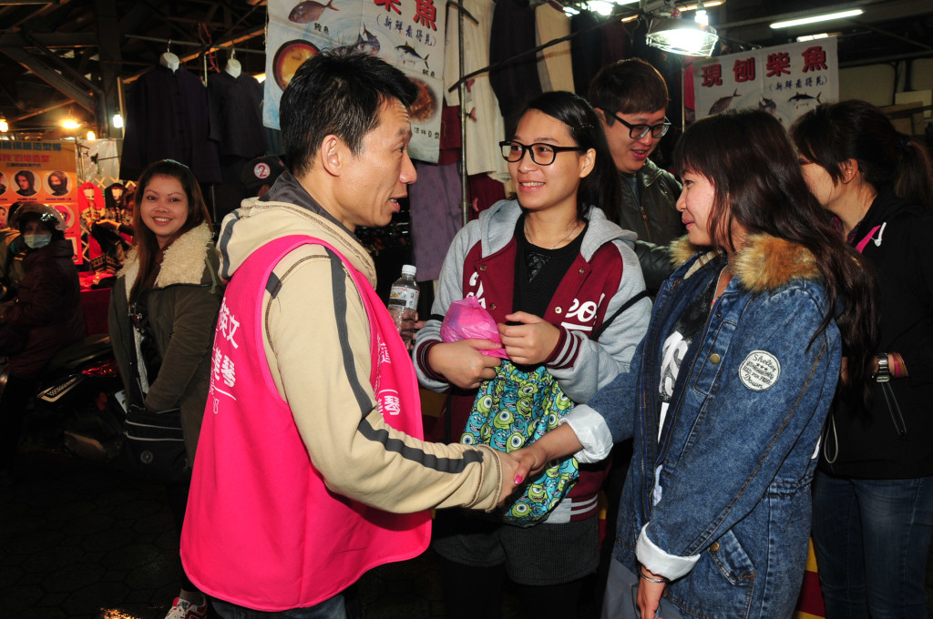 藝人郭子乾到花蓮幫蕭美琴拉票,在菜市場受到歡迎。(記者王志偉攝)