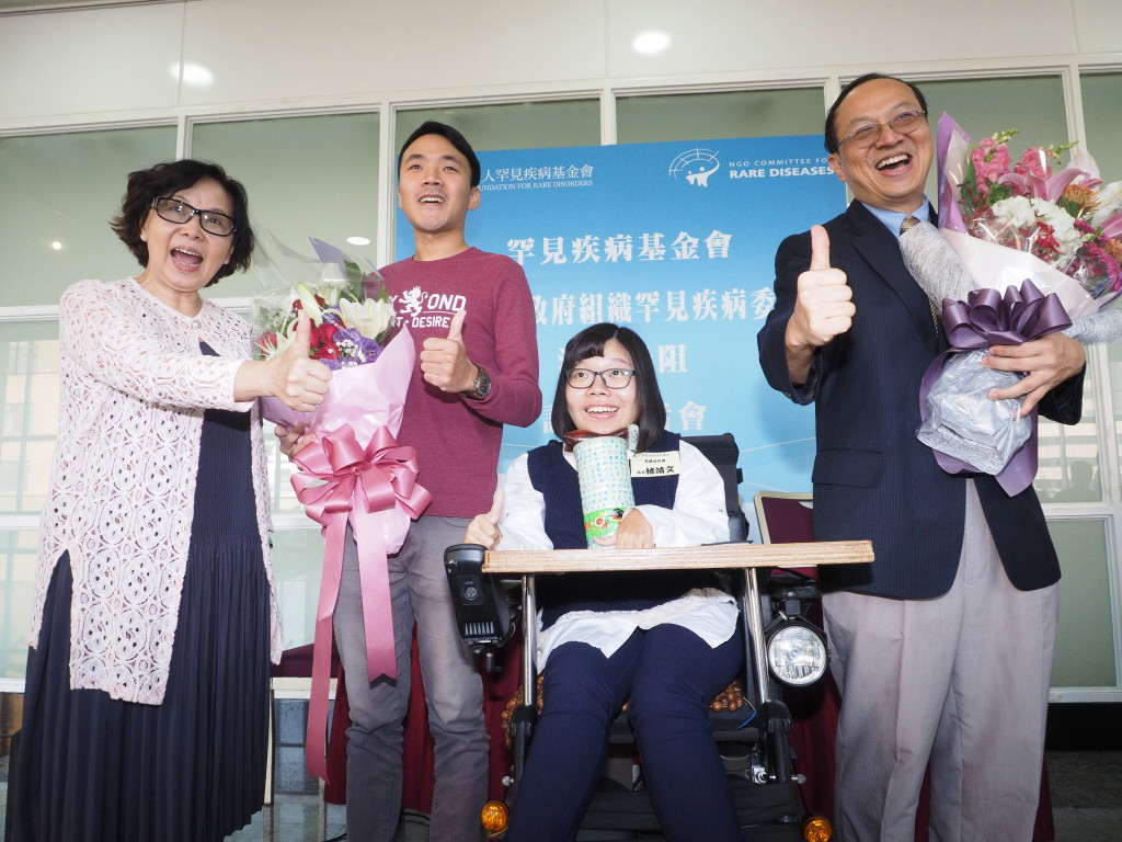 對於台灣罕病基金會聯合國演講受阻,創辦人陳莉茵與董事長曾敏傑接受罕病兒獻花致意。圖/張家銘