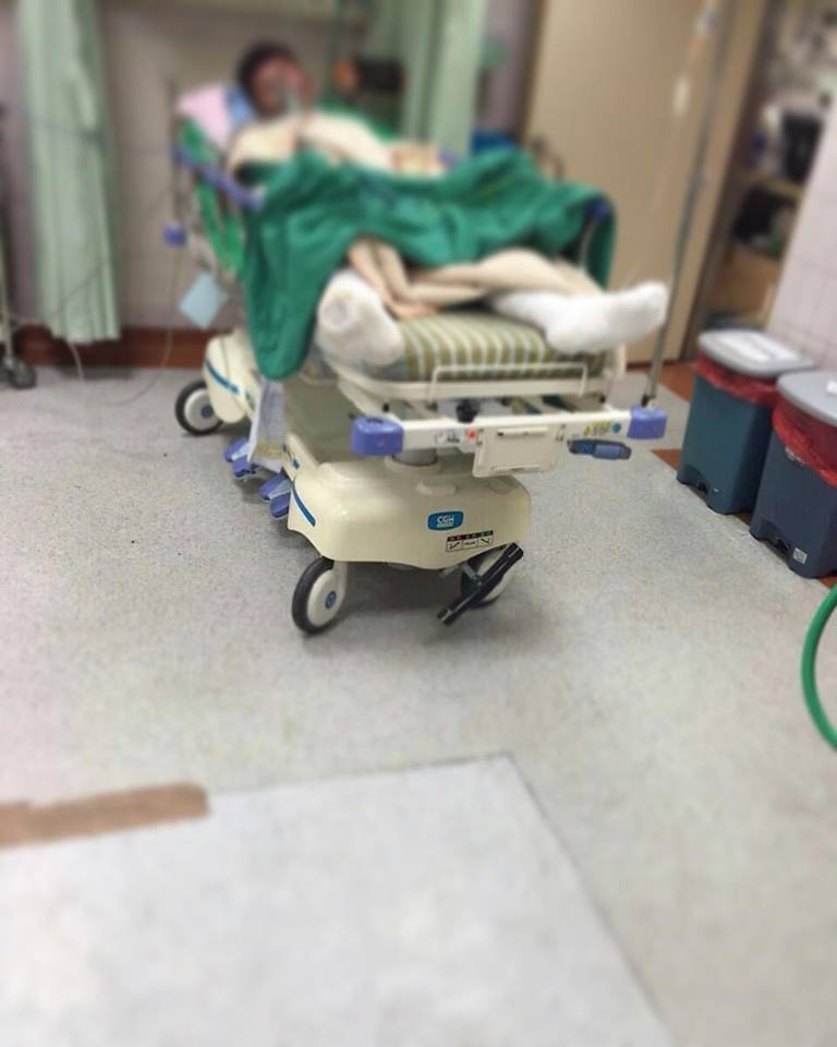原本救護人員把他抬上救護車,他看到旁邊的2個傷患情況更不妙,已呈昏迷狀態,他禮讓對方先上車,後來覺得好冷好痛,送醫後不省人事,醒來後已是14天後,在加護病房搶救1個月轉至普通病房,全身60%二至三度灼傷,傷勢集中在四肢。