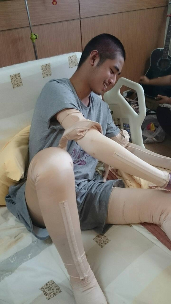 出院之後,好幾次復健過程都想放棄逃跑。老家在台東,他出院之後就近在高雄復健,「很多次都快哭出來,那種皮被拉開、撕開的可怕感覺,沒經歷過的人真的不能體會」,他說「有時真的不想去復健、不想被折磨,但父母逼著去、又陪在一邊,沒辦法『落跑』」,只得咬牙苦撐。