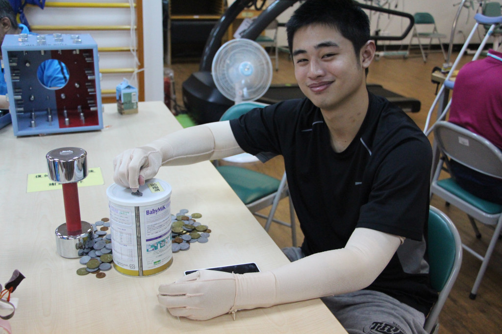 復健-每個動作都像撕裂般疼痛,曾讓他想逃跑。因為家人的愛,讓他堅持下來。圖/陽光基金會提供