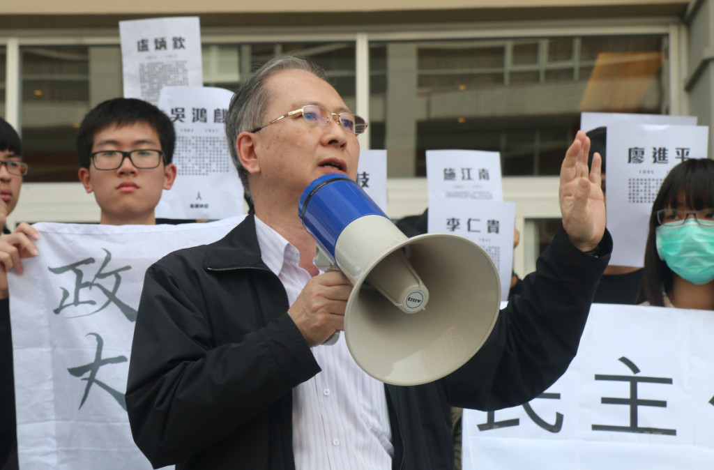 正當多位老師輪番上陣助講時,一名身材高大的中年男子闖進打斷,要求發表談話,學生則以呼口號表達反對;蔡炎龍講話後,又有一名自稱是政大外交系校友的年長女性,一把搶過大聲公,對學生的抗議行動表達不滿,甚至與先前的中年男子為了爭搶發言你跑我追,滑稽的場面讓不少人當場笑出聲來。