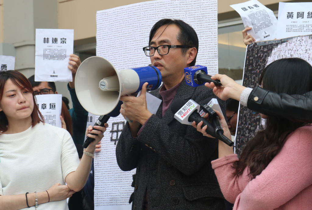 「政大戒嚴、校方道歉」,學生們有的舉著當天張貼的228受難者姓名及生平簡介,有的手舉標語,高喊口號,對校方以威權者姿態撕毀海報的事件表達嚴正抗議。