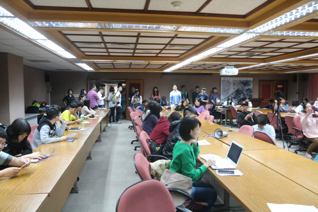 記者會結束後上七樓會議室,等待學務長出面回應。