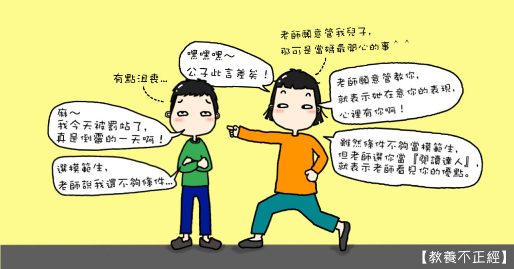 「兒子,你知道嗎?馬麻不可能隨時看到你,特別是白天,幸好有老師幫我注意你平常的表現,如果老師發現你表現不好,就表示老師可是時時把你放在眼裡、掛在心上,所以我肯定老師很在意你、關心你,願意立刻修正你,讓你變得更好,所以馬麻超級感謝老師的呀!」