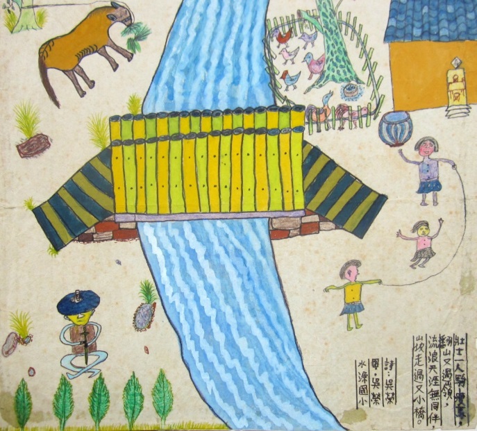 1973年國小六年級的吳榮將元朝馬致遠的《天淨沙》古詩改創成純真有趣的詩畫。