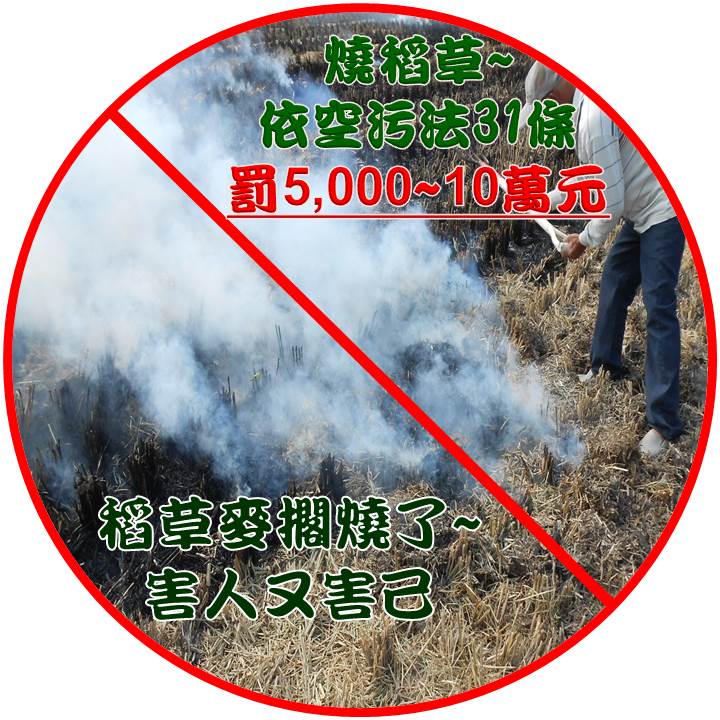 環保局呼籲農民朋友「嘜擱燒稻草了」!露天燃燒不但浪費再利用價值的稻草資源,還會破壞環境造成空氣污染,並危害人體的健康,若濃煙導致發生車禍造成傷亡時,也必須負刑責,是多重不當行為,應極力避免。