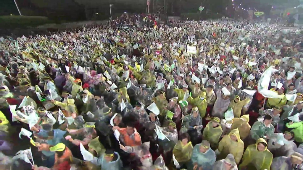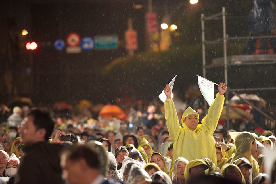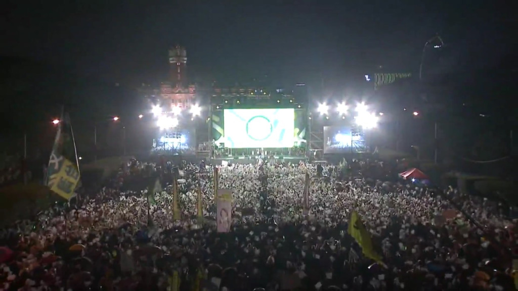 民進黨總統候選人蔡英文今(15)晚在台北雙城各舉辦一場造勢晚會,雖然下著毛毛細雨,仍不減民眾熱情支持,紛紛穿著雨衣,向現場加油打氣,為其中在凱道截至晚間8點,已湧進2萬人,民進黨強調距離執政,只差最後一里路,不過今晚一位歌手林生祥則說今晚是來送「國民黨最後一里路」。