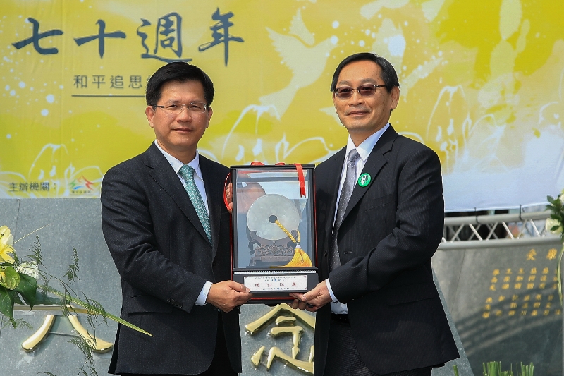 時值228 70周年,紀念會上特別邀請在228事件中,為台灣人發聲的參議員林連宗的外孫廖英豪與會,代表接受市長頒贈刻有「成仁取義」的紀念牌。