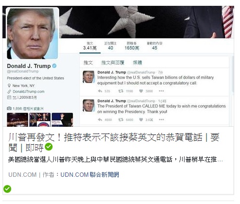 川普也不甘示弱,直接在自己的推特(Twitter)繼推文感謝台灣總統蔡英文的恭賀外,又再發佈第二篇推文:「有趣的是,美國賣數十億美元武器裝備給台灣,卻連一通祝賀電話都不能接。」