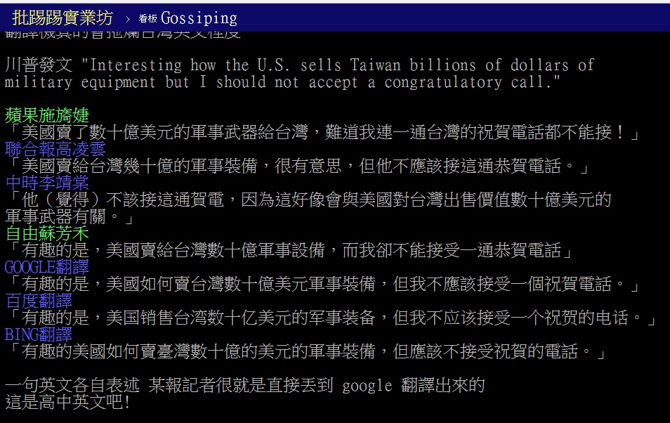 然而這篇推文雖然被國內媒體大篇幅引用,但《聯合報》卻以「川普再發文!推特表示,不該接蔡英文的恭賀電話。」、《中時》電子報第一時間也將川普該段發文譯為「他(覺得)不該接這通賀電,因為這好像會與美國對台灣出售價值數十億美元的」,內文將反諷的說法翻成不該接台灣恭賀電話,少翻譯了But的反意,遭到網友狂洗版。網路PTT立即出現「川普一句話讓台人英文現形的八卦」熱烈討論串,列出各報與翻譯軟體的對照,發現譯錯的媒體與網路翻譯軟體十分相近,有網友認為,「翻譯機拖爛台灣英文程度」。