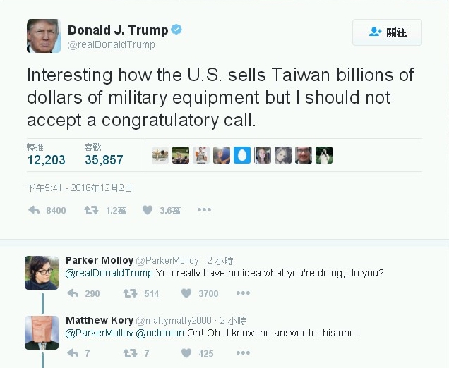 美國總統當選人川普今(3)日推特上表示與台灣總統蔡英文通電話後,卻有美國媒體批評川普不了解美外交政策。但川普也非省油燈,稍早再度再推文反酸,美國軍售台灣數十億美元裝備,難道連一通祝賀電話都不能接。