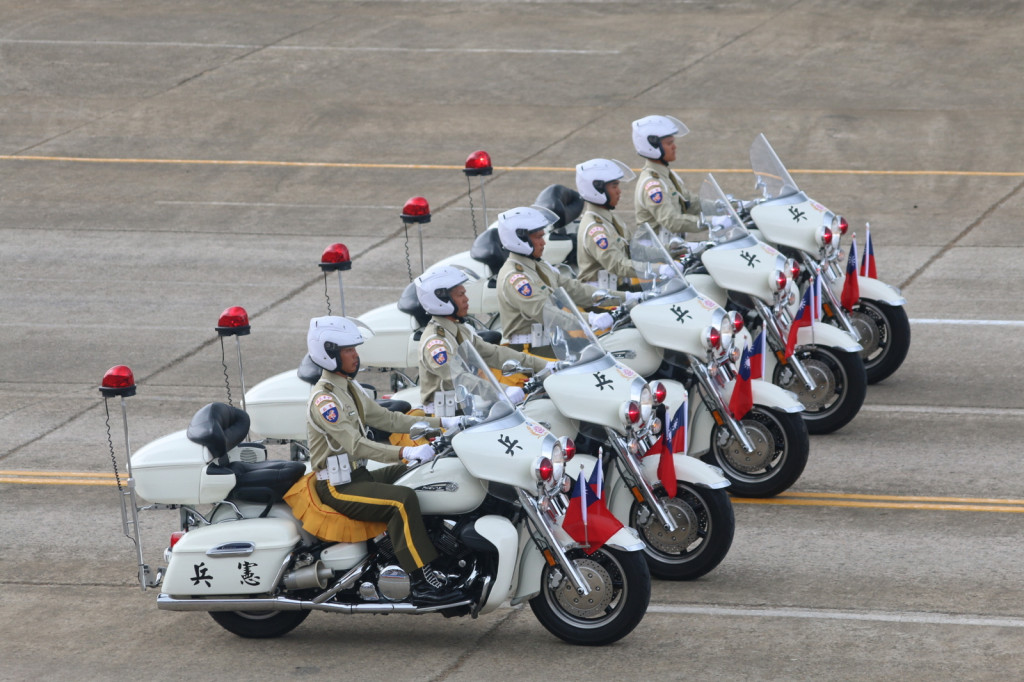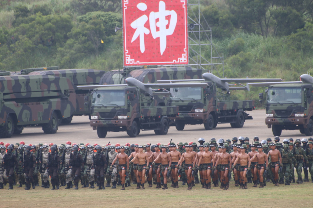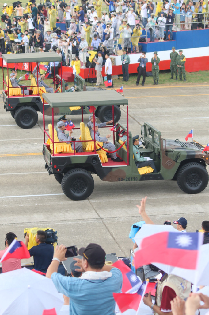 地面展示部隊則有各式戰車、甲車、砲車,UAV無人飛機,以及包括雷霆2000多管火箭、雄三、雄二、天弓、愛三、拖式、標槍等各式現役飛彈,另還有陸軍特戰連、海陸偵搜大隊等特戰部隊,連近年已很少現身的憲兵機車連也在隊伍當中。