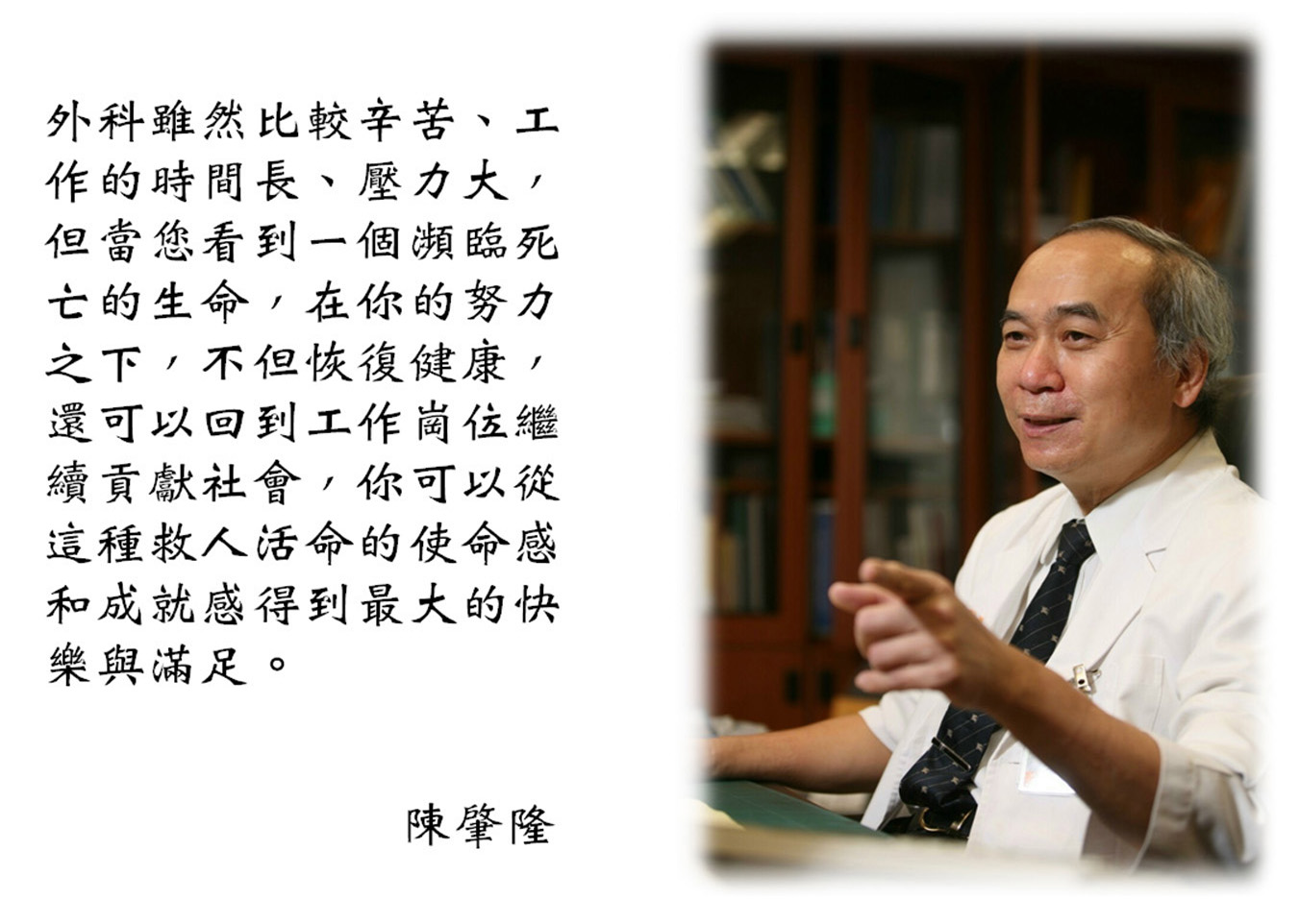 陳院長在結束專訪時指出,外科,特別是肝臟移植,雖然比較辛苦、工作的時間長、壓力大,但當您看到一個瀕臨死亡的生命,在你的努力之下,不但恢復健康,還可以回到工作崗位繼續貢獻社會,你可以從這種 救人活命的使命感和成就感 得到最大的快樂與滿足。