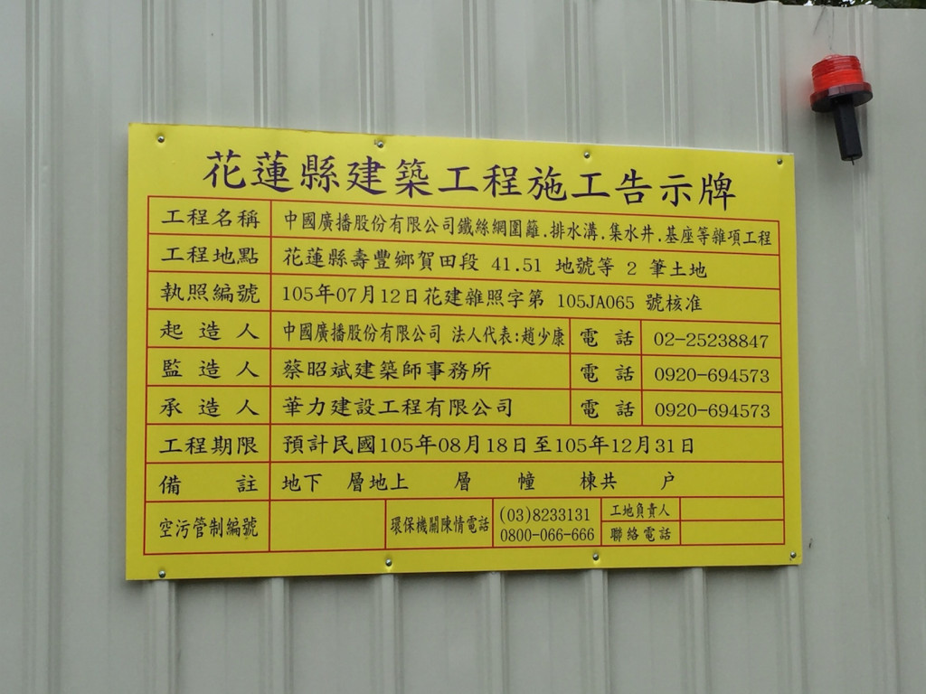 圖:中廣將搬離,現正在東海岸山區進行電台基地施工,施工告示牌法人代表:趙少康。(王志偉攝)