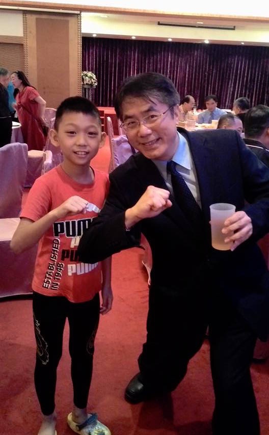 黃偉哲跑完喜宴攤之後,跟小朋友比個加油手勢,作為圓滿結束。圖/取材自黃臉書