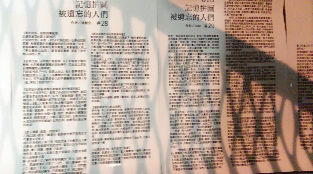 去年318占領立法院行動在持續近一星期後,馬政府始終不願正面回應學生訴求,引發群眾不滿,在3月23日當天發動占領行政院行動,卻遭警方暴力鎮壓,在周年前夕,黑島青重回青島東路現場舉辦「走回無光的所在--眾生。群像:重說318」活動,展出318運動相關圖片、文字與影像,並搭配跨夜的公共論壇,以多角度敘事的方式重構318。