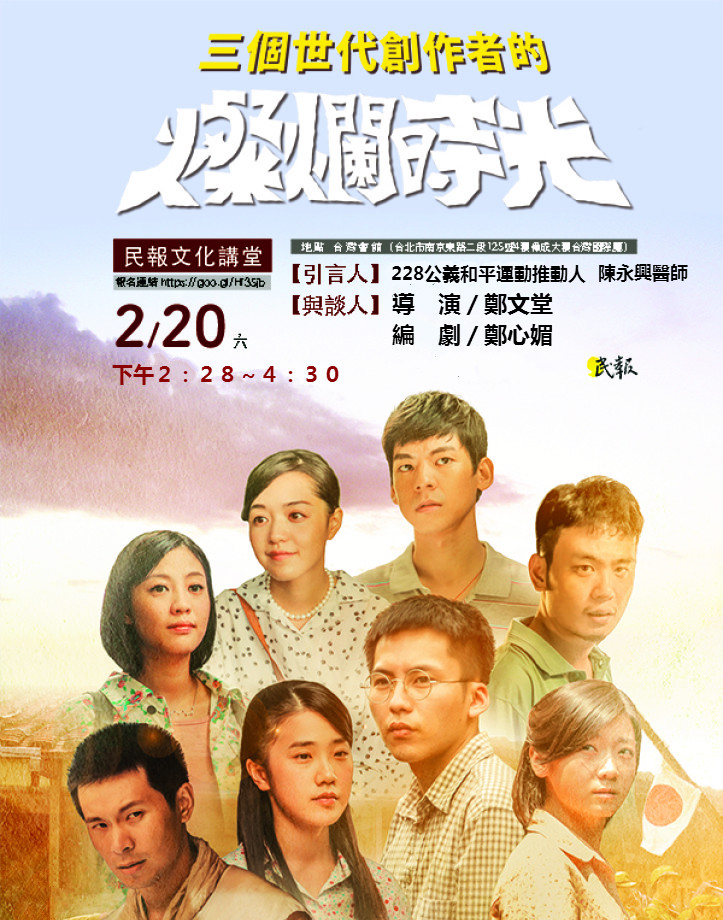 【編按】2月20日,禮拜六,下午2點28分,以二二八、中壢事件、美麗島事件為時代背景,講述台灣從烏雲到陽光的過程的偉大史詩故事《燦爛時光》,幾位跨世代創作者包括導演、編劇,都將齊聚一堂,並由台灣歷史上首次推動228平反運動的人權醫師陳永興擔任引言,要聊一聊這屬於台灣式的「燦爛時光」。歡迎您一起來。煩請事先上網報名,免費入場。(活動詳情請見文末,座位有限,報名網址連結:https://goo.gl/HT35jb )