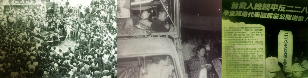 中壢事件(左),台灣人挺身對抗強權,憤怒衝向公署砸爛警車;高雄事件(中),震動全世界,奠定台灣解除戒嚴開放國會全面改選的基礎;228事件四十周年(右)台灣人終於突破心靈禁錮,要求政府平反、道歉、賠償。(圖:翻攝自綠色年代一書)