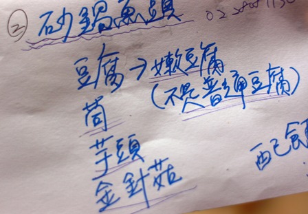接著,陳先生又開出菜單,寫下他心目中希望加到砂鍋裡與魚頭共同烹煮的,包括金針菇、豆腐、大白菜、魚丸等等配料。(左圖,安寧照顧基金會提供)