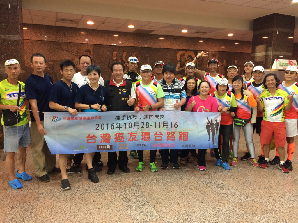 十多位台灣癌友單車運動協會的癌友們,一路跑進了門諾醫院大廳,有別往年騎著自行車環島,今年特別以路跑方式挑戰環台,癌友們臉上看不出一絲的倦怠,反而個個充滿活力,台灣癌友單車運動協會理事長謝永照表示,希望藉此鼓勵其他癌友,只要相信自己,就有重生的機會。