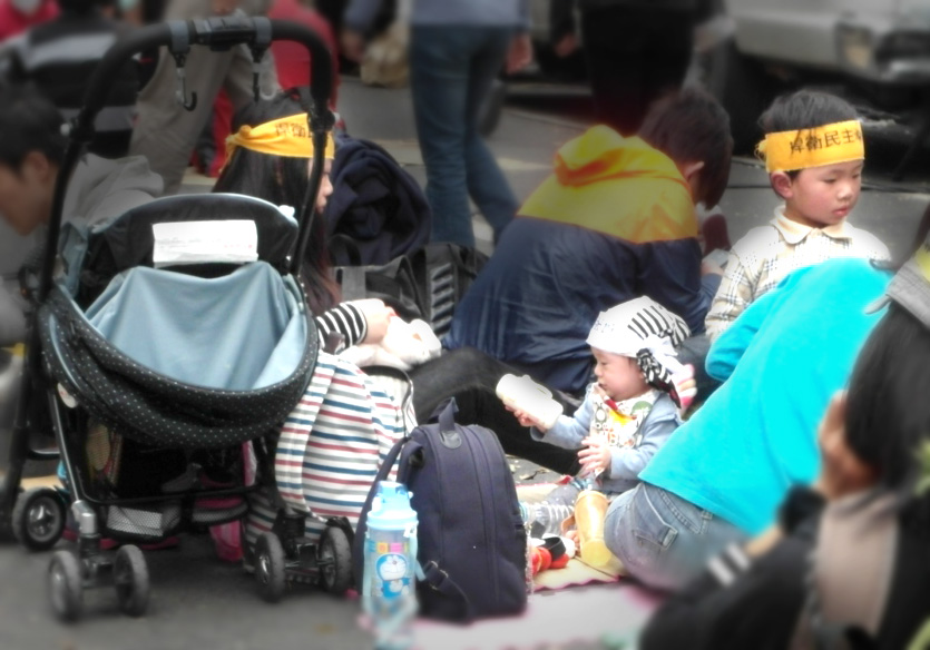 「打在兒身,痛在娘心」,政府處理學運的態度、對待學生的方式,讓許多為人父、為人母者的心也跟著受傷了,靜坐現場不只是學生、社會人士,有年輕媽媽帶著剛會站會走的娃娃,頭綁抗議布條坐在現場,她們用行動表達訴求。