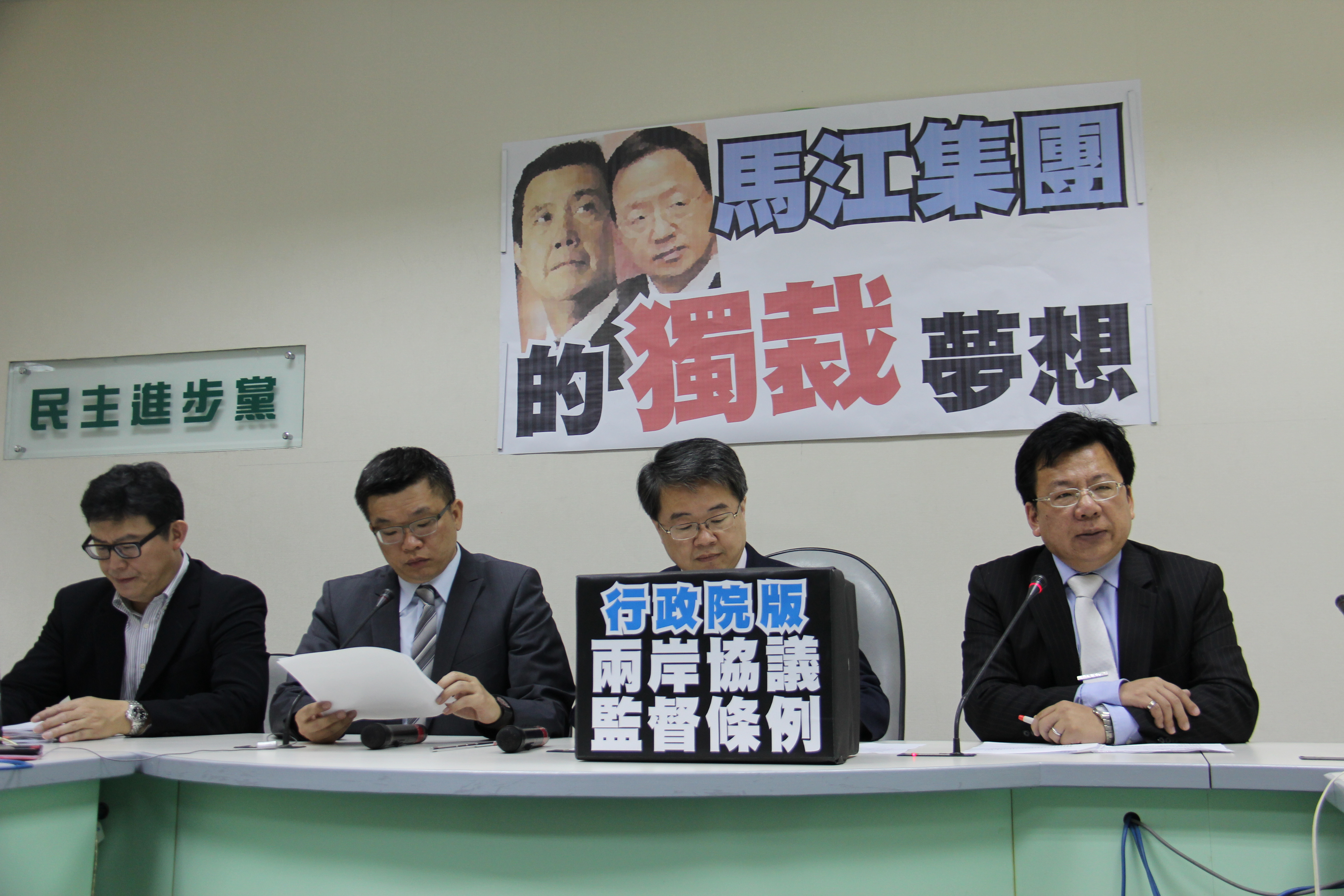 立委李俊俋、吳秉叡、蔡其昌及姚文智於今(9)日上午在立院民進黨團辦公室召開記者會,針對今早馬總統對於兩岸協議監督機制法制化的發言,齊聲痛批馬總統此舉根本是要搞行政獨裁且毫無憲政素養。