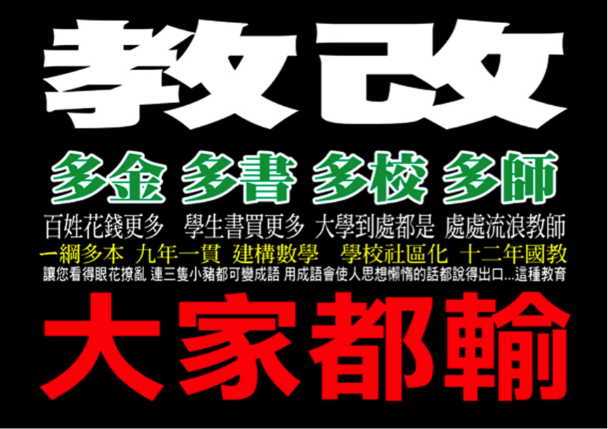 教育不可亂改:過去一連串的教改,記憶裡從台北的志願就學方案開始,歷經漫長13年以失敗收場。…另起爐灶的一綱多本、九年一貫、建構數學、學校社區化、優質化,名稱琳琅滿目…,每個學校都在為這些把戲忙得不可開交。一百六十幾所大學…現在已經嚐到惡果,慘況歷歷在目;現在還在方興未艾的玩十二年國教、偷偷修改課綱?多金、多書、多校、多師;百姓花錢更多、學生書買更多、補習班種類、生意更多、大學到處都是、處處流浪教師、碩士、博士滿街都是…眾多怪異現象,結果造成「大家都輸」。請問:「這樣的傷害,難道還不夠大嗎?」。