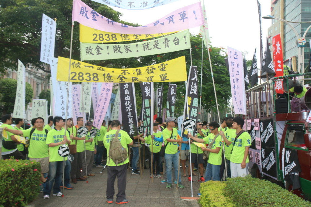 近千名抗議群眾手舉「敗金、敗家,就是賣台」、「核四廠不准發電,2838億全民買單」、「電力自由化不是萬靈丹」、「反對圖利財團、反對拆解台電」等布條,人人身穿「怒」字綠色上衣,今天上午齊聚中山南路監院門外,抗議立法院將《電業法》修法排進優先法案,強調若修法通過電價將會不合理上漲,訴求全民將因此受漲價之苦。