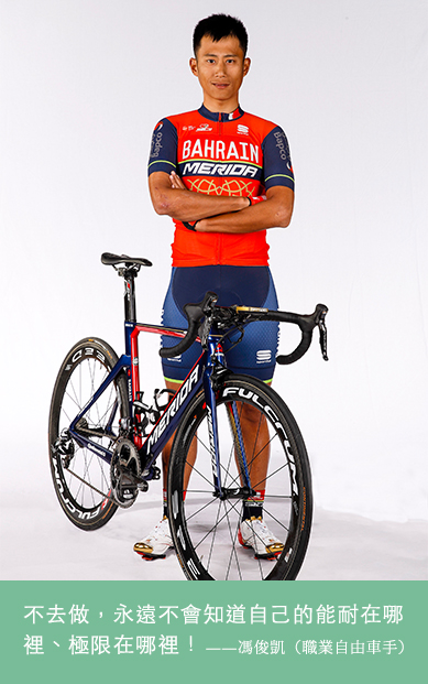馮俊凱的目標不變:前進三大賽,特別是環法自由車賽,宛如職業車手的聖殿。今年他早早準備並展開賽季,就是希望更早進入狀況,能為20天以上的大賽做足準備。馮俊凱的眼神發亮,正如他始終告訴自己的:「做就對了,不去做,永遠不會知道自己的能耐在哪裡、極限在哪裡!」