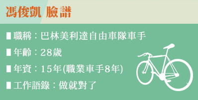 「我小學時其實是全校最胖的耶!」馮俊凱說得認真,但聽過他這麼說的人,無不瞪大眼睛:直呼「怎麼可能!」但他總面不改色,認真說著小時候住在山上,放學回家要走上坡,累了就在路上睡覺的往事。國中時展開自由車訓練,原因之一也是為了減肥,但當初誰也沒想到,當年的小胖子,後來成為台灣的自由車一哥,更一路騎進世界殿堂,成為台灣加盟一級職業車隊的第一人。