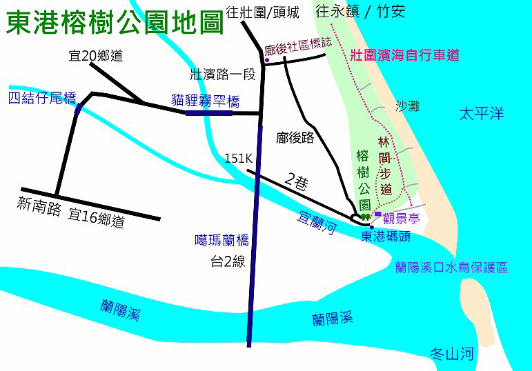 東港碼頭旁有一處榕樹公園。 種植兩排十幾棵榕樹,樹冠枝葉茂盛,彼此相連, 濃蔭形成天然的綠色涼亭,樹下有攤販商家及投幣式卡拉OK,供遊客遊憩。 榕樹公園底處有一間大眾爺廟,祀奉早期因戰亂、 械鬥或病亡的無主孤魂枯骨。 大眾爺廟旁有小路,通往附近的觀景平台,附近有兩條林間步道,稱為「東港休憩漫步道」, 與海岸的自行車道相接,可以右去左回,環繞一圈。右線林間步道較靠蘭陽溪河口, 步道路況較佳。 曾經還只是小小的、不起眼的小樹苗,後來小樹苗逐漸長成大樹,而且還不是普通的樹喔,是一株株的榕樹。 起初樹小不能成蔭,也就沒有如今的公園,後來榕樹成蔭之後,開發成榕樹公園,榕樹下成了附近居民和遠來此地的遊客們的梯往上走,則是小孩的遊樂設施。