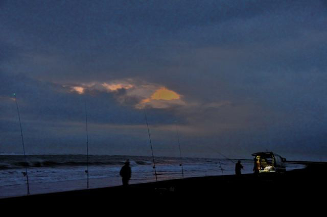黎明時曉:燈光通明的車廂顯得夜釣客有備而來,一眼望去十數隻夜釣魚竿排排站到出海口