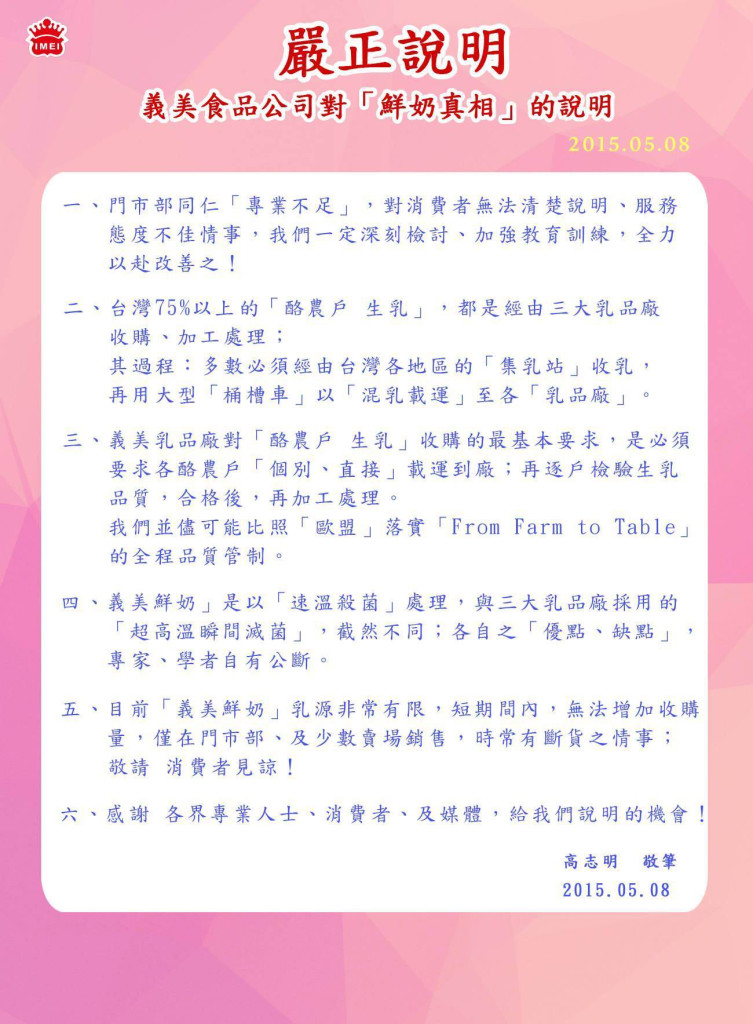 最後高志明強調,目前「義美鮮奶」乳源非常有限,短期間內,無法增加收購量,僅在門市部、及少數賣場銷售,時常有斷貨之情事;敬請 消費者見諒,同時也對門市部同仁「專業不足」,無法對消費者清楚說明、服務而有態度不佳情事,將做深刻檢討,並加強教育訓練,全力以赴改善,同時也感謝各界給予說明機會。