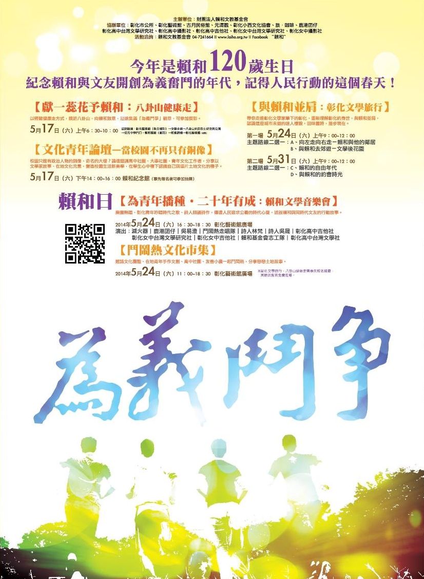 為紀念「台灣新文學之父」賴和120歲冥誕,賴和文教基金會舉辦「2014賴和音樂節:為義鬥爭」系列活動,邀請大家在5月17日「獻一蕊花予賴和」,文化青年論壇,24日再與賴和並肩展開彰化文學之旅、聆聽文學音樂會,再一起至文化市集「鬥鬧熱」。