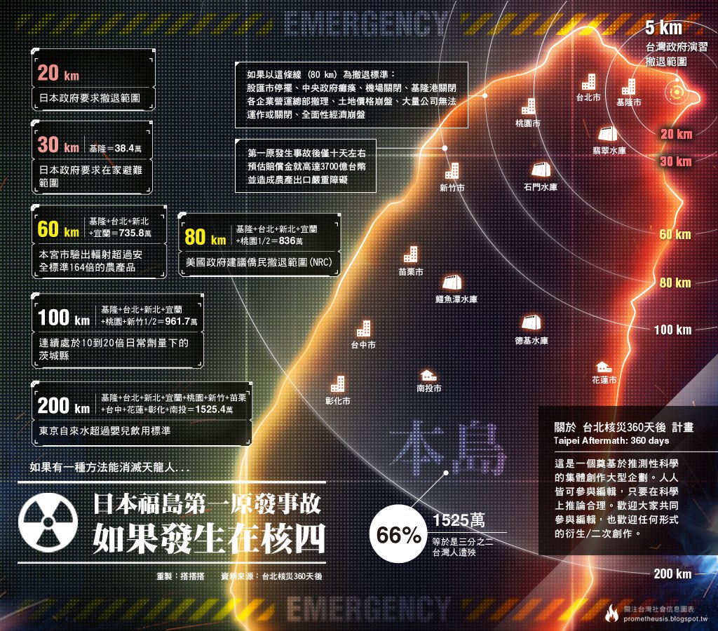 為了台灣人基本生存權,一定要投給堅決反核的候選人,即使這樣的候選人可能沒有老舊勢力撐腰,比較嫩一點,但也絕對不能投給擁核政客或對核電無感的人,即使所投候選人沒當選,但還是能反映這是廢核票,本身意義就很大,千萬別靠大邊就投給擁核的候選人。(右圖:若福島核災發生在台灣。翻攝自關注臺灣社會信息圖表)